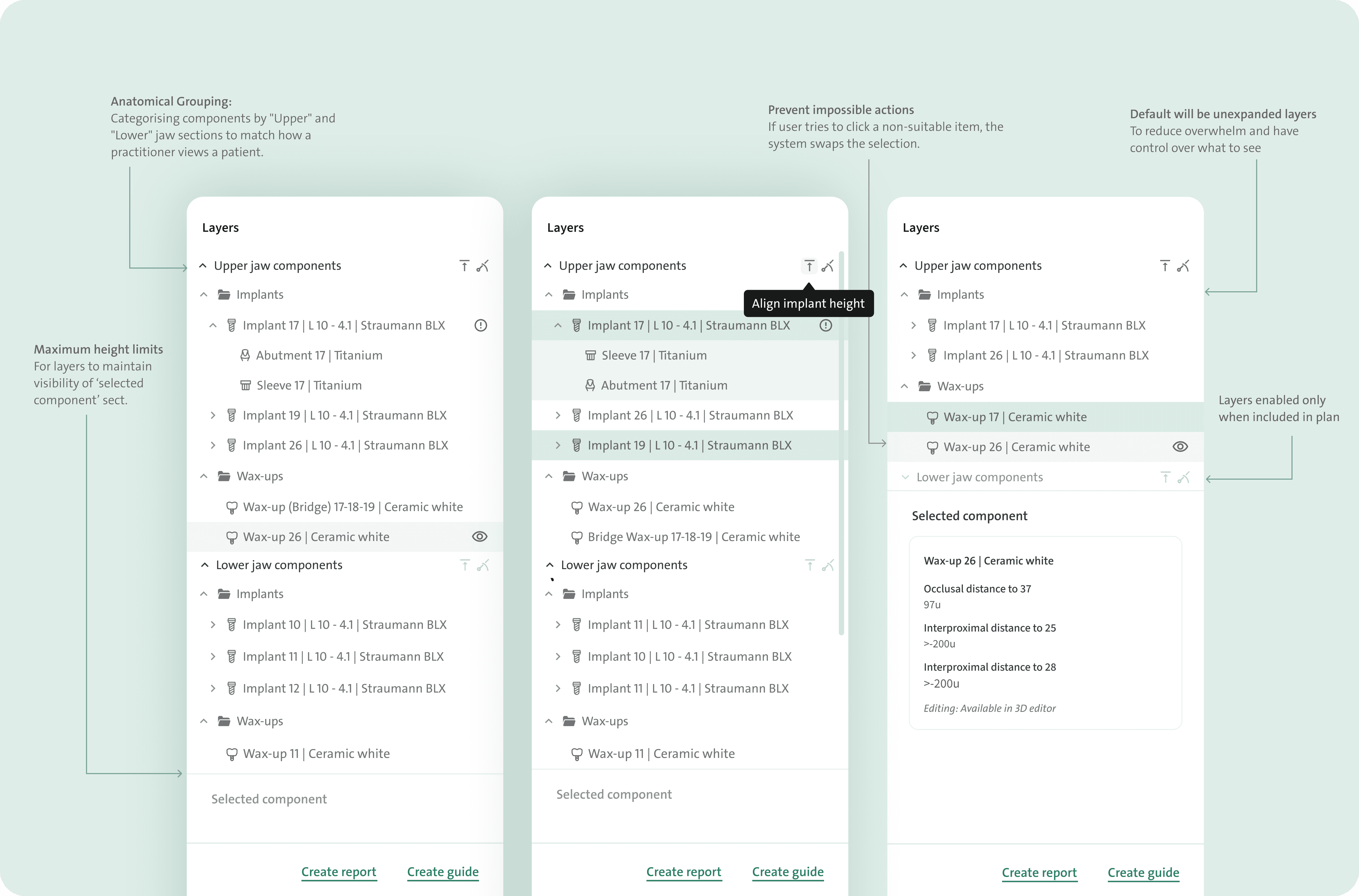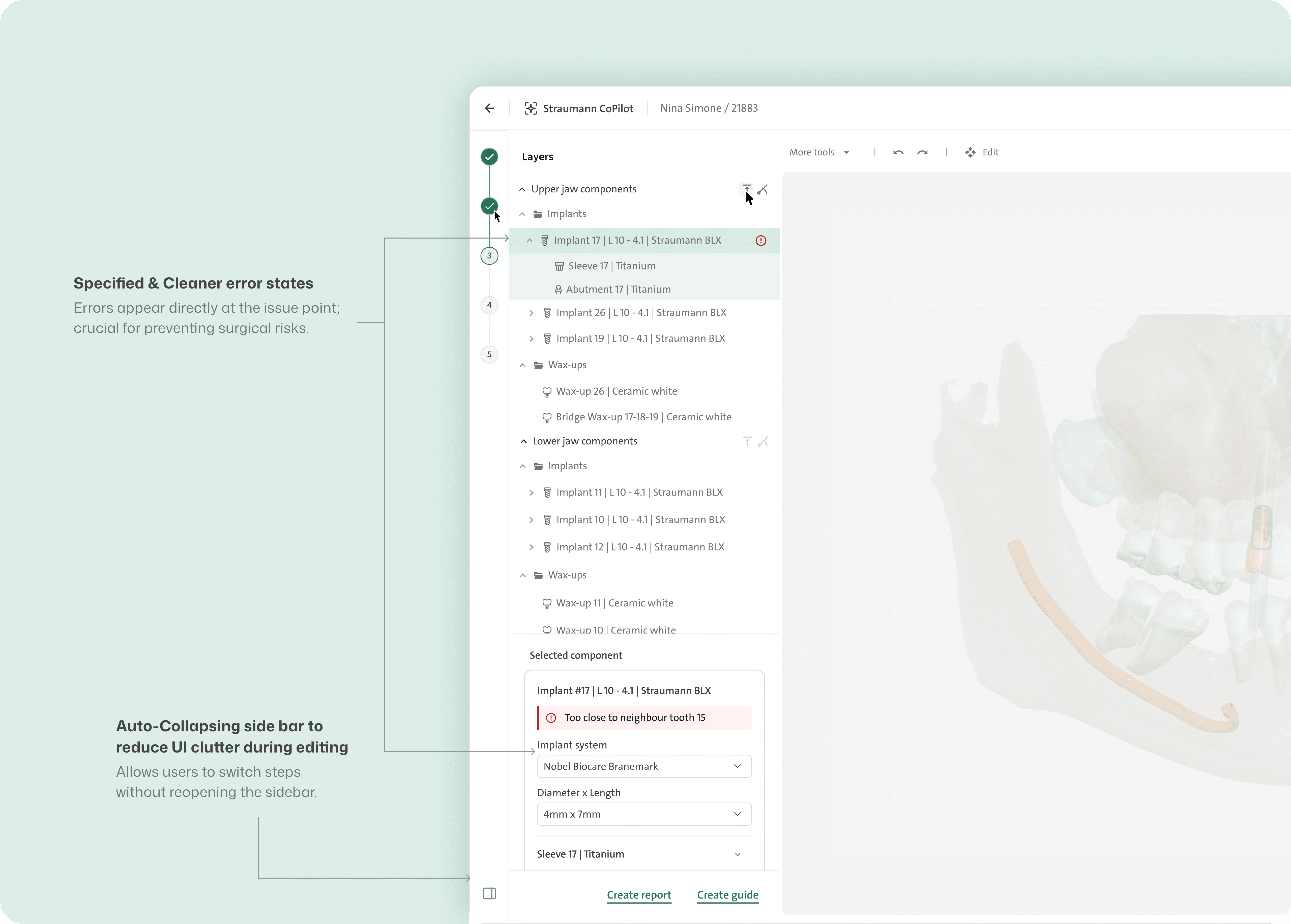 Inspection windows are small openings on the implant guide 3D model that let dentists visually confirm if the guide is fully seated, requiring precise placement during digital planning. Hence, how the windows will be interacted with, not only in the 2D left panel but also in the 3D editor, needed to be defined.